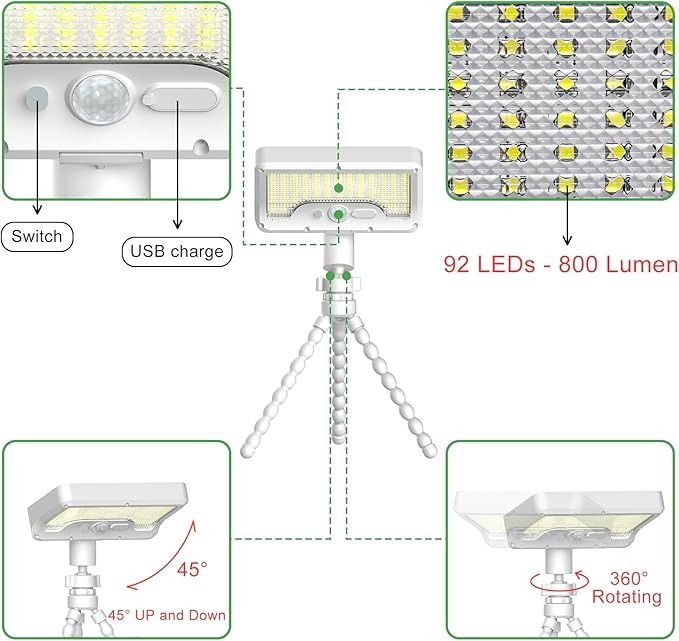Illuminate any space, anywhere with the all-in-one Solar Motion Floodlight & Tripod. Its flexible, octopus-style legs wrap around trees, poles, tents, or fences—no tools required—while the 360° swivel head and eight-segment legs let you pinpoint dark spots with unmatched precision.