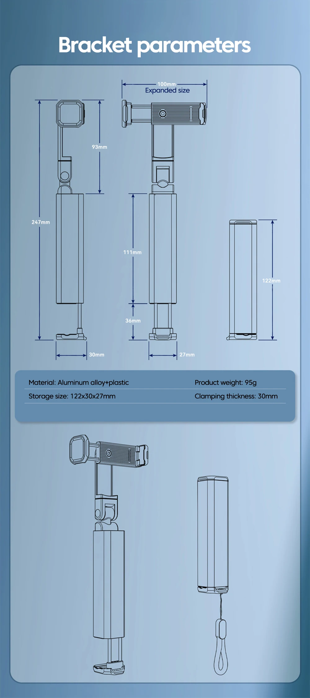 1. Portable design: This mobile phone holder is designed to be compact and can be easily put into a pocket or bag. Whether you are on a plane train or car you can easily carry and use it.